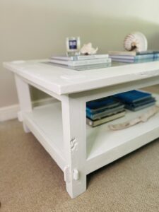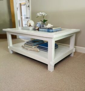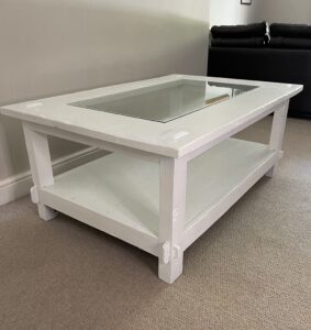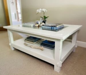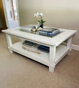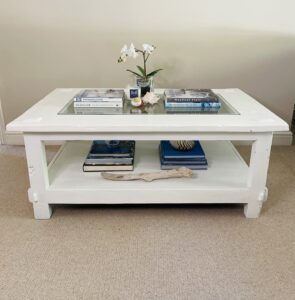 Very cool, large beach house style coffee table with a glass top and lower shelf. Perfect to display and put books, ornaments, shells, etc.
