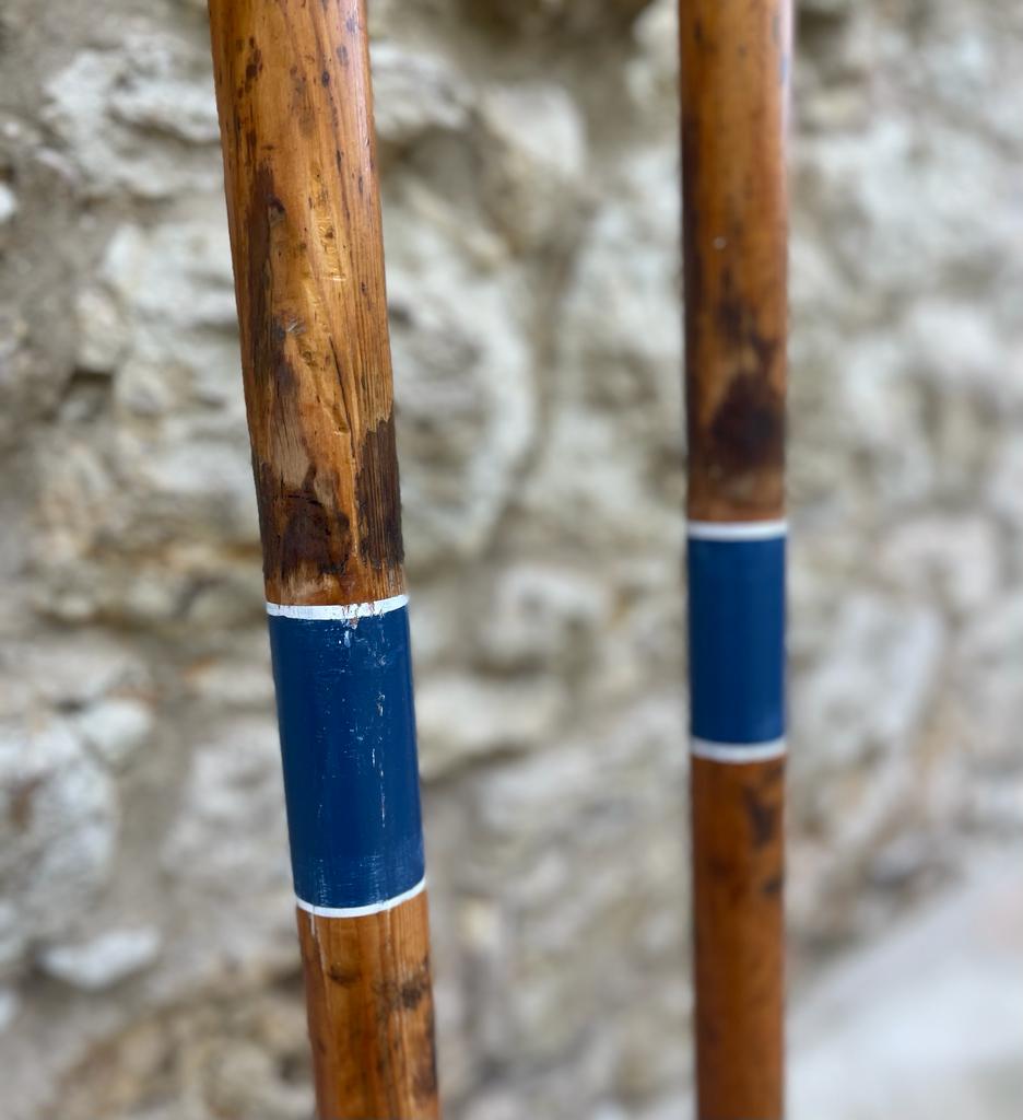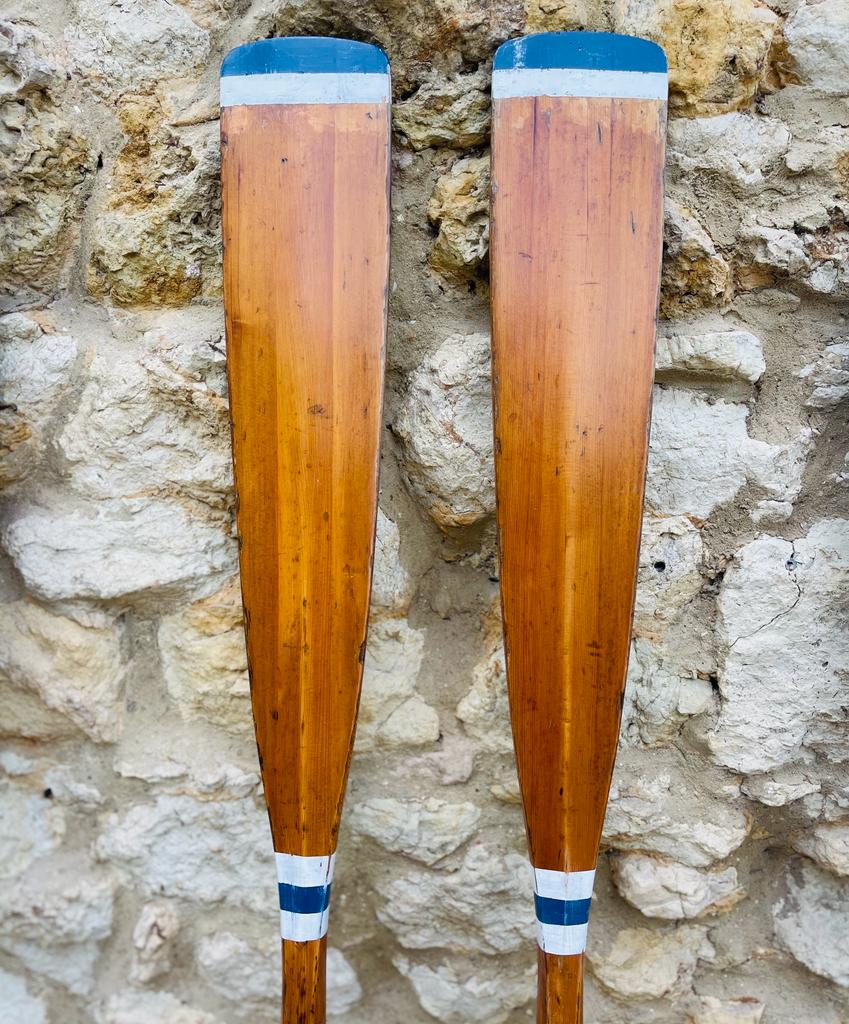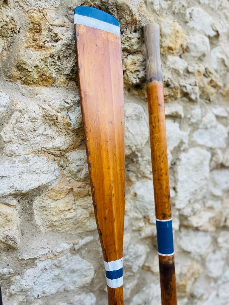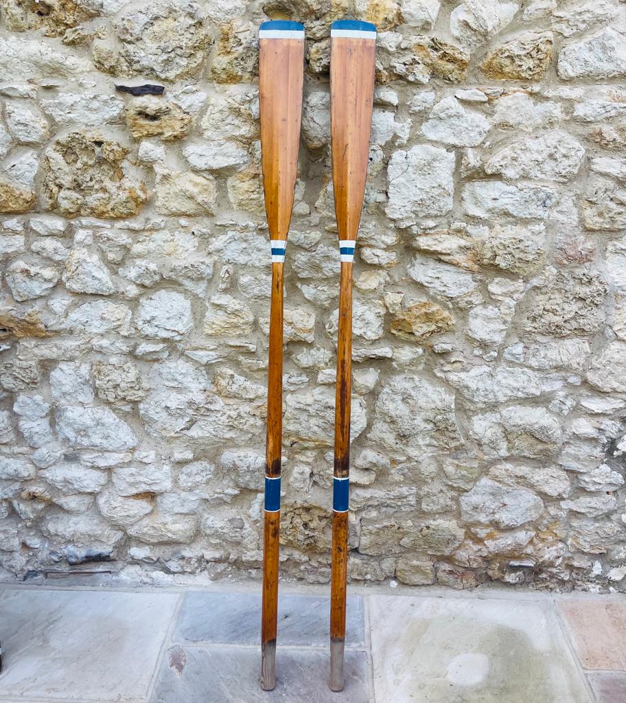 Stunning vintage wooden oars. Blue and white detailing on polished wood.