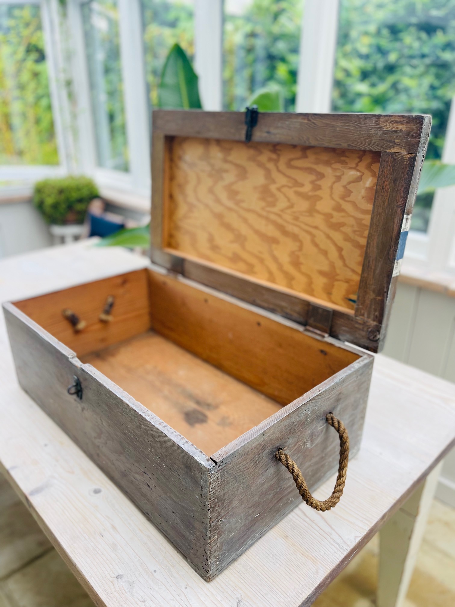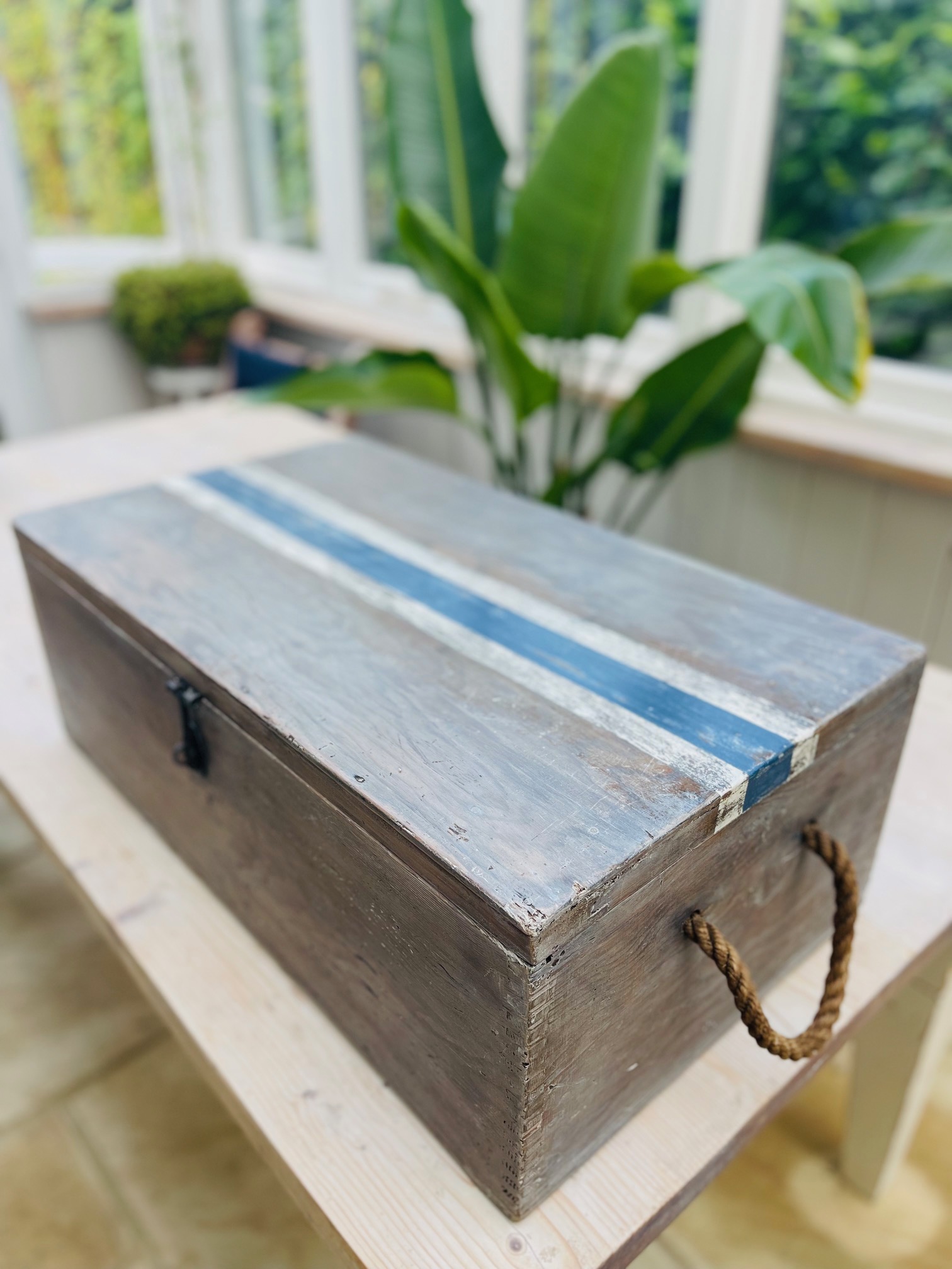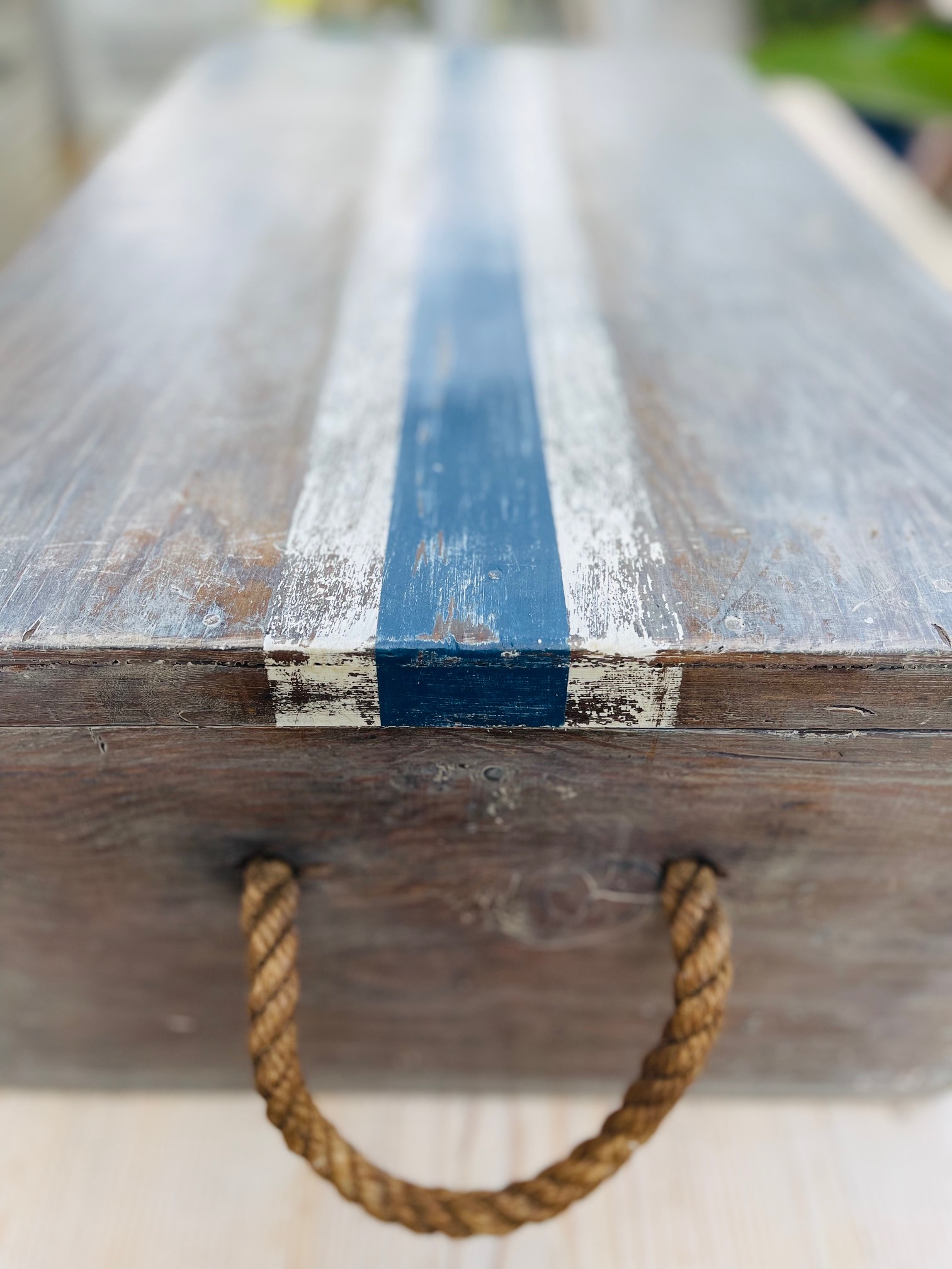 Nautical Style Vintage Wooden Box with Rope Handles.  Lime washed with nautical detailing.