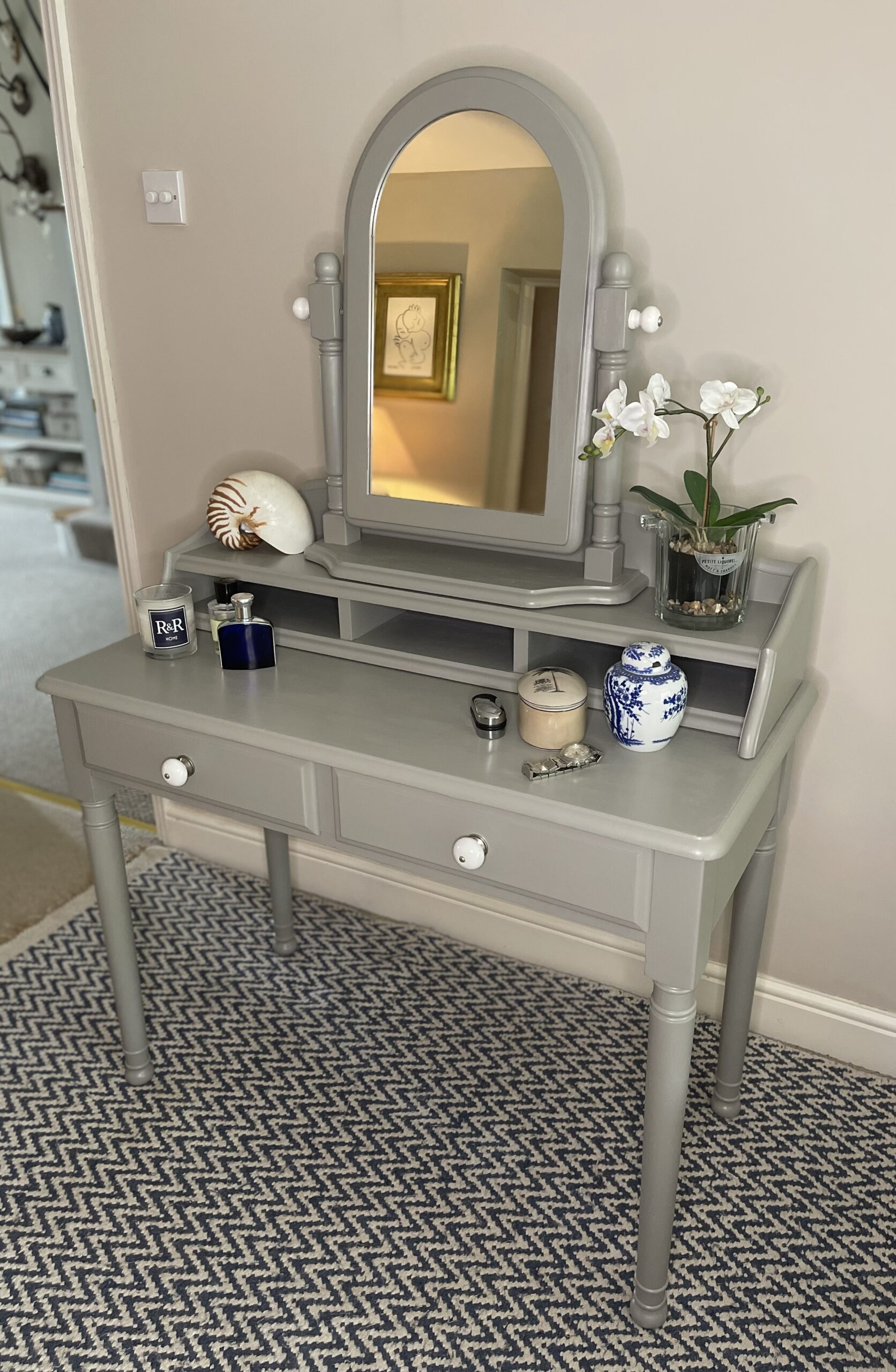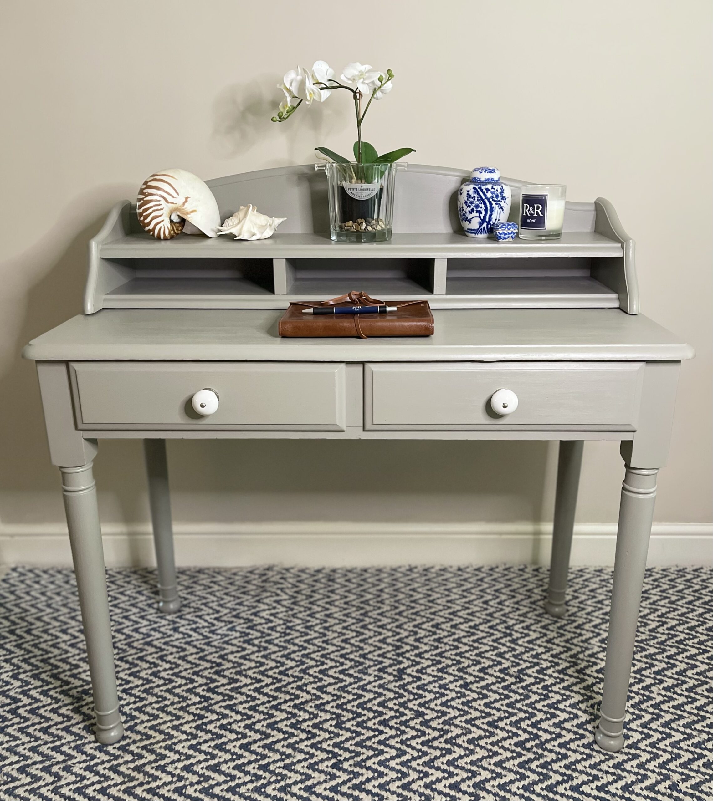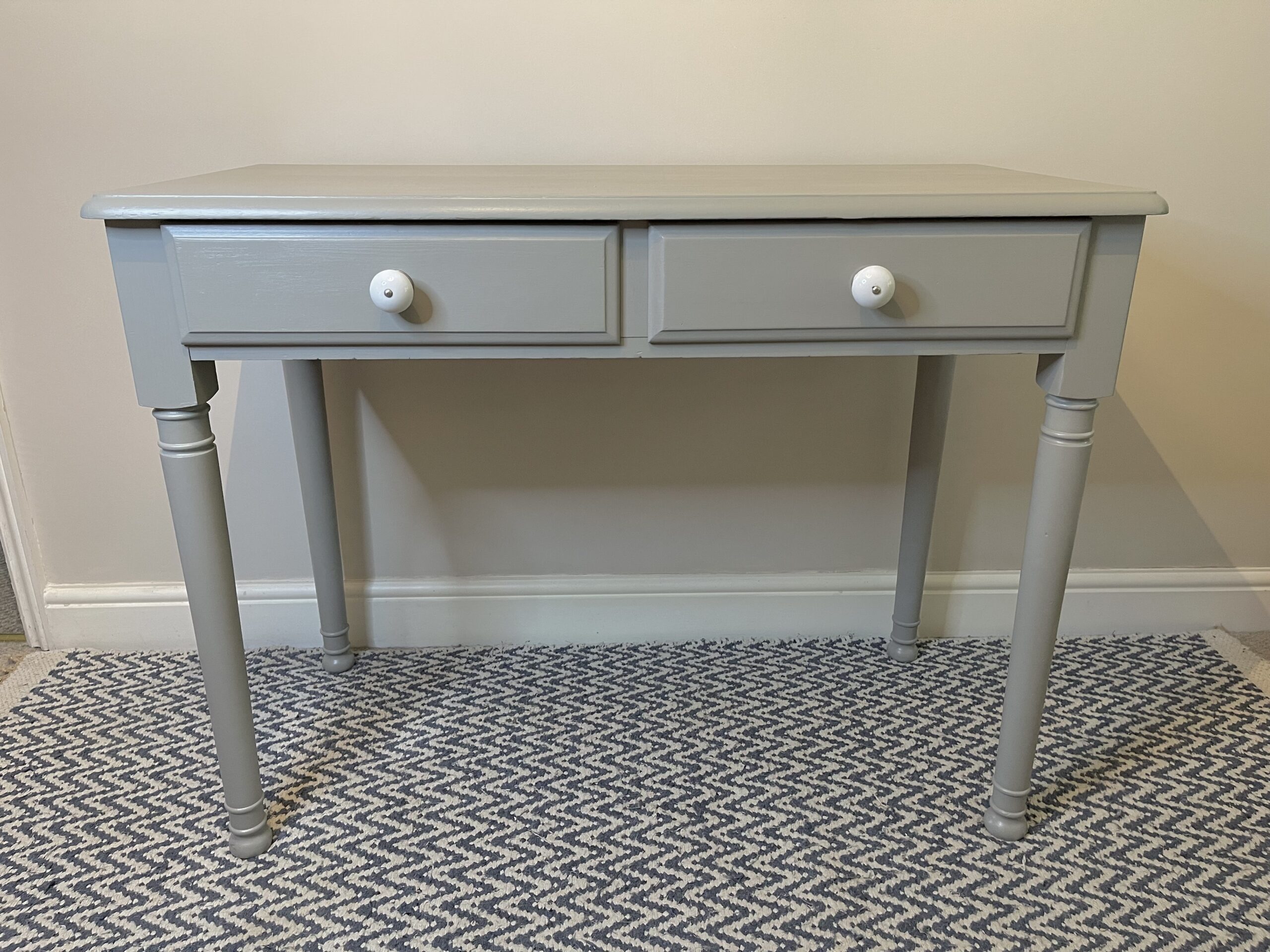 A versatile pine writing table finished in soft grey. Can be used as a work desk, a dressing table with mirror, a console table or simply a piece to use anyhow and anywhere you want. Use all the units together or separately.