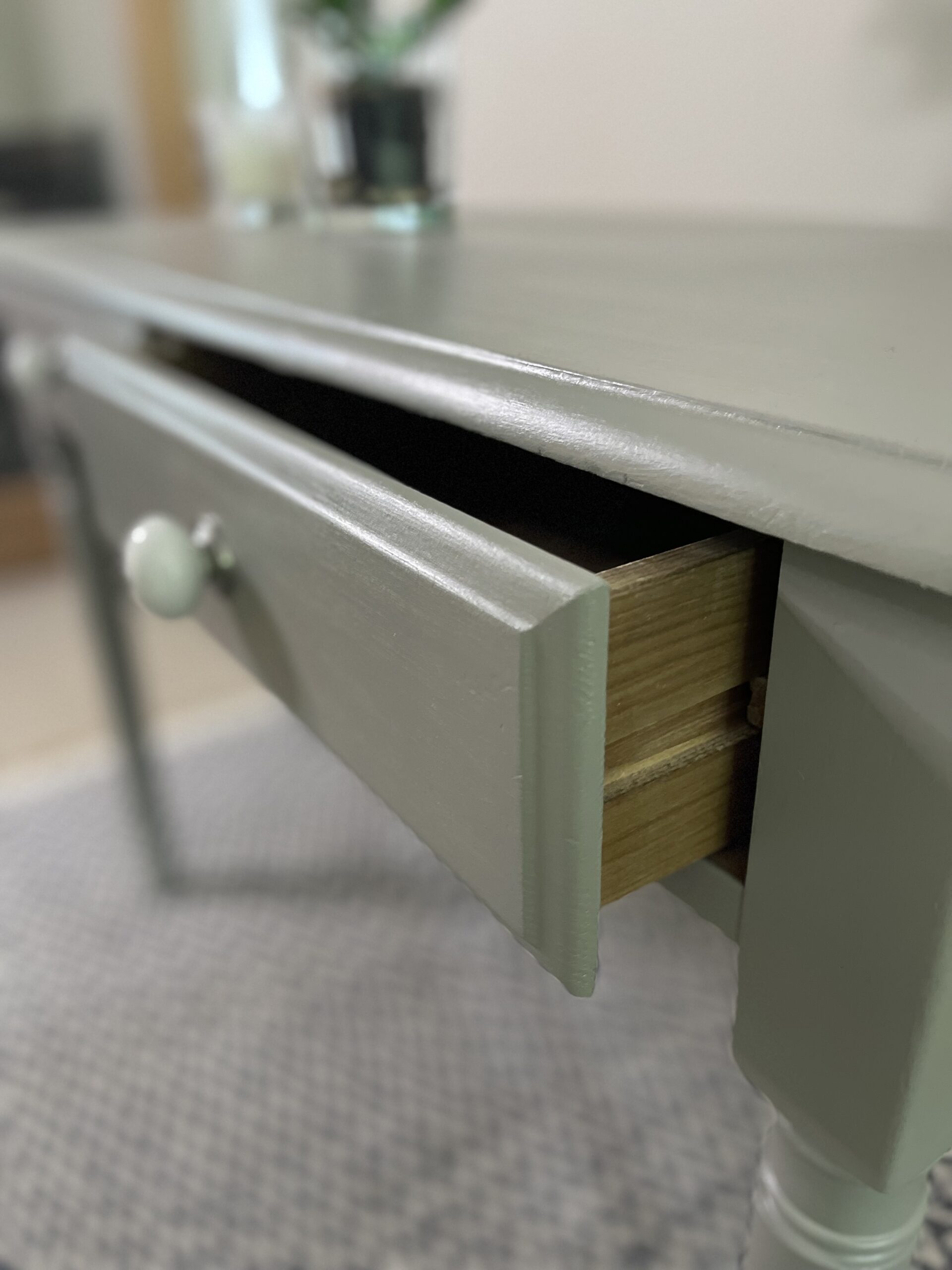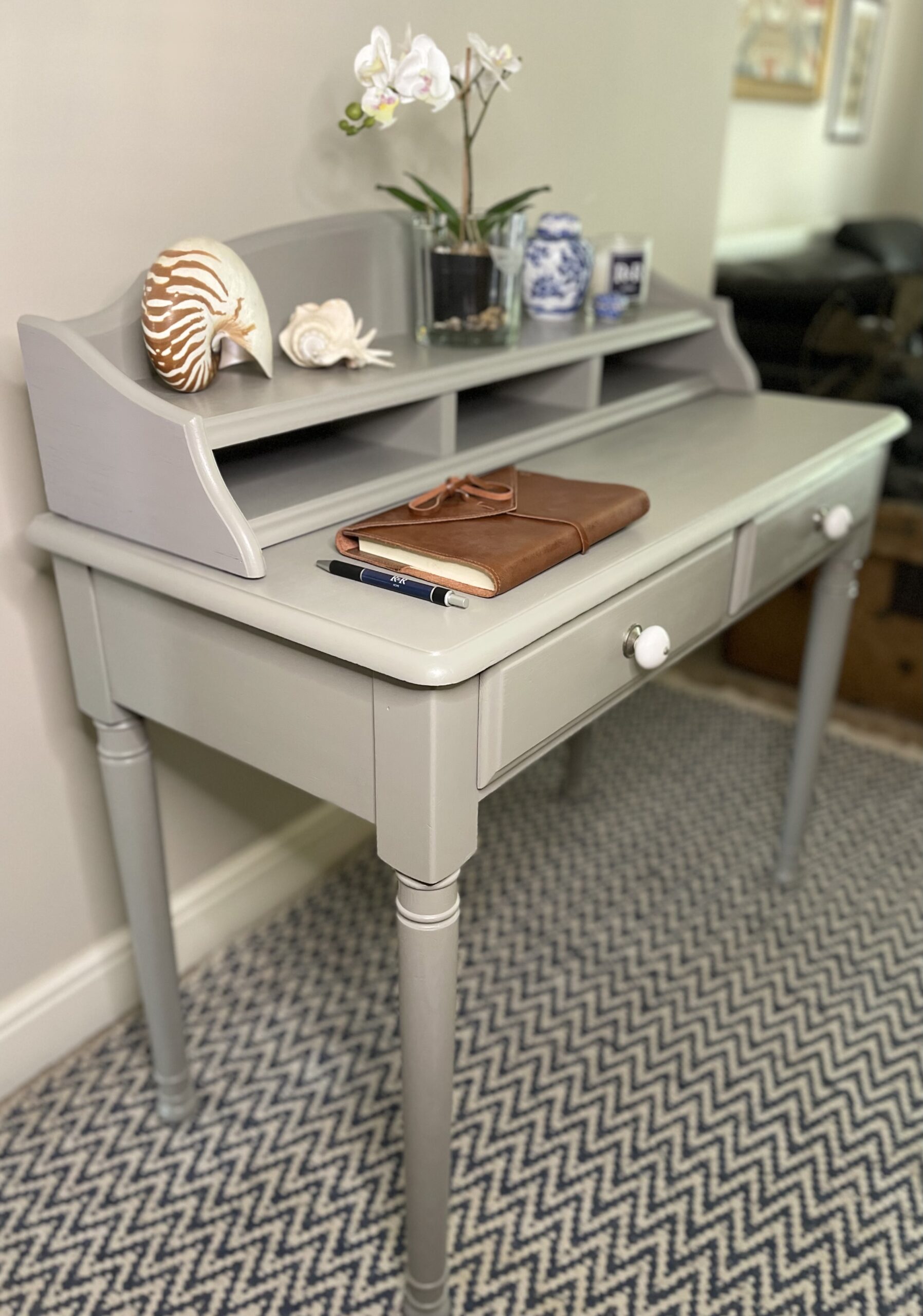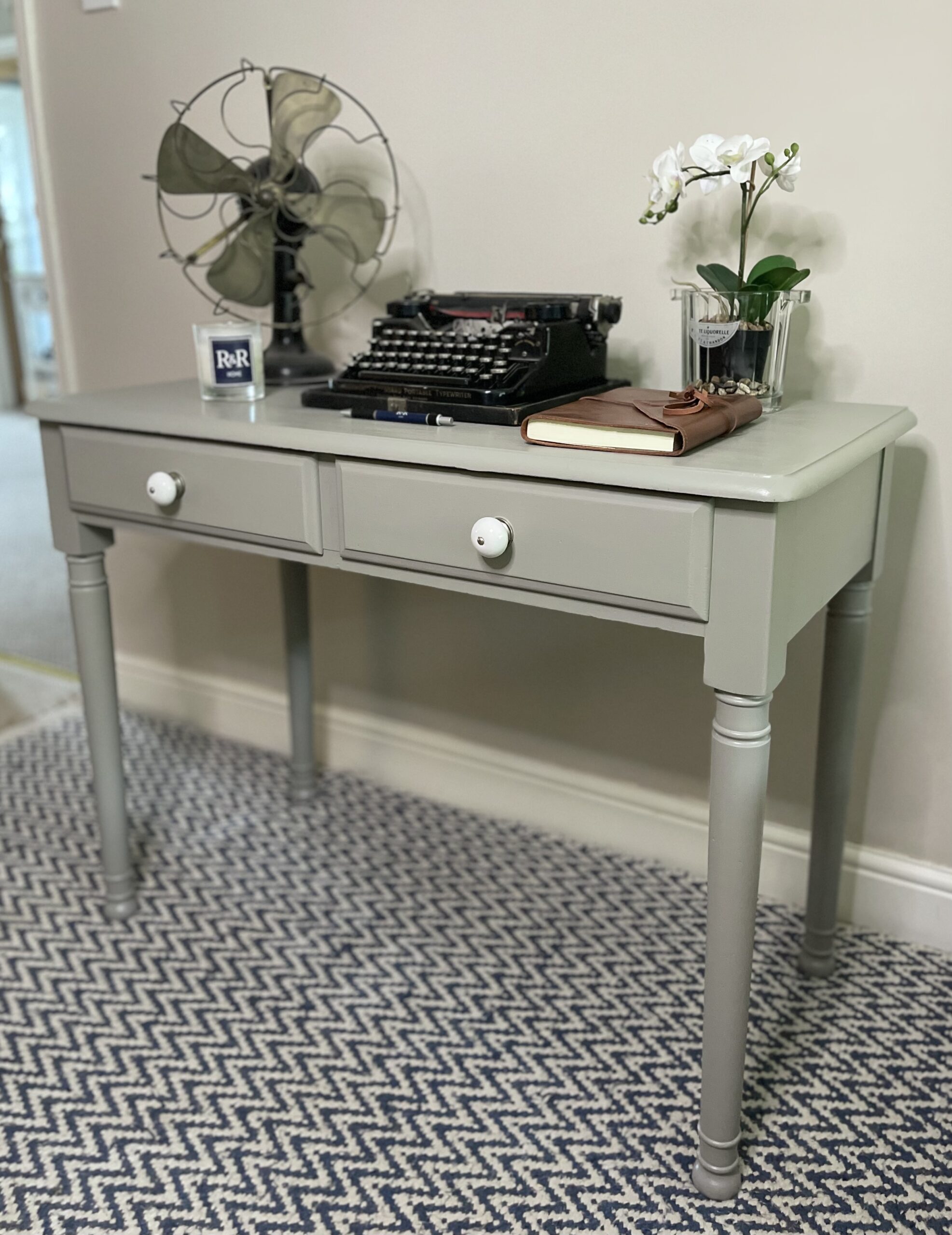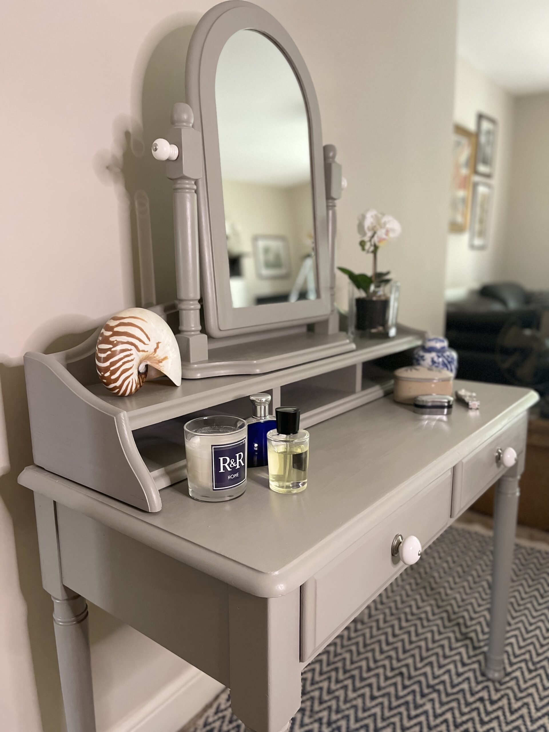 A versatile pine writing table finished in soft grey. Can be used as a work desk, a dressing table with mirror, a console table or simply a piece to use anyhow and anywhere you want. Use all the units together or separately.