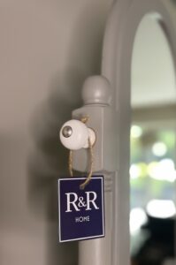 Two front drawers with white ceramic knobs.